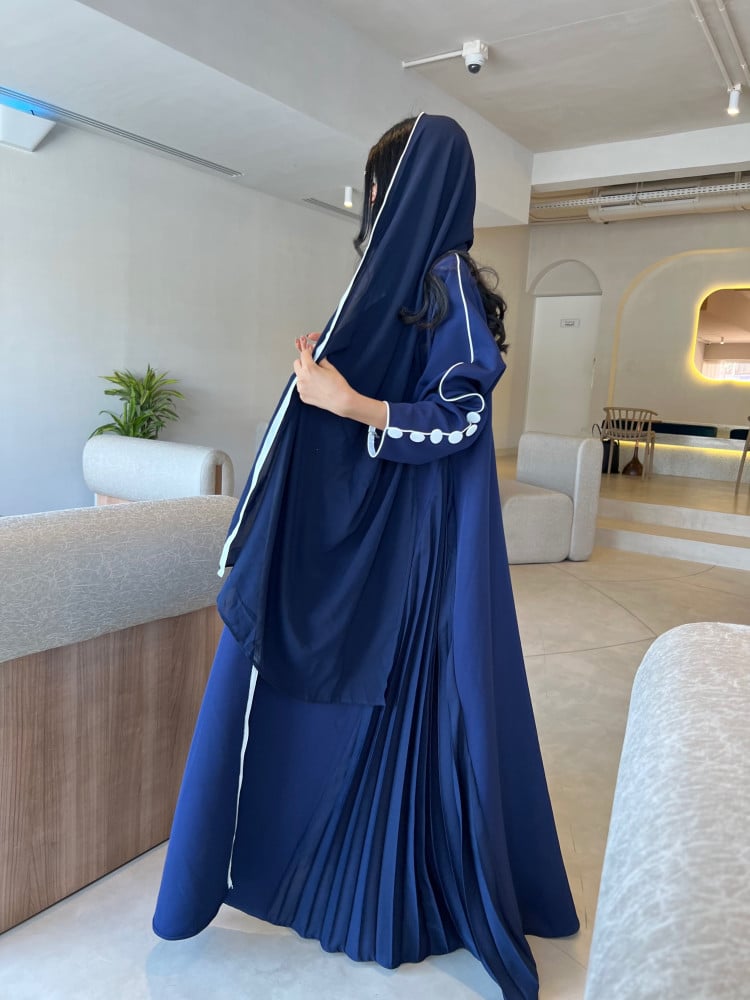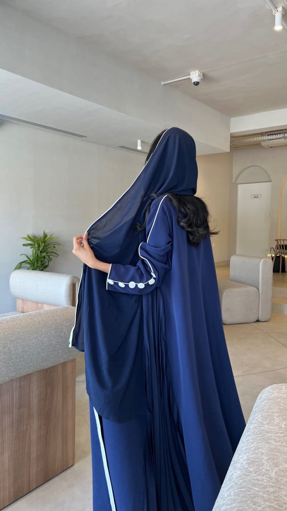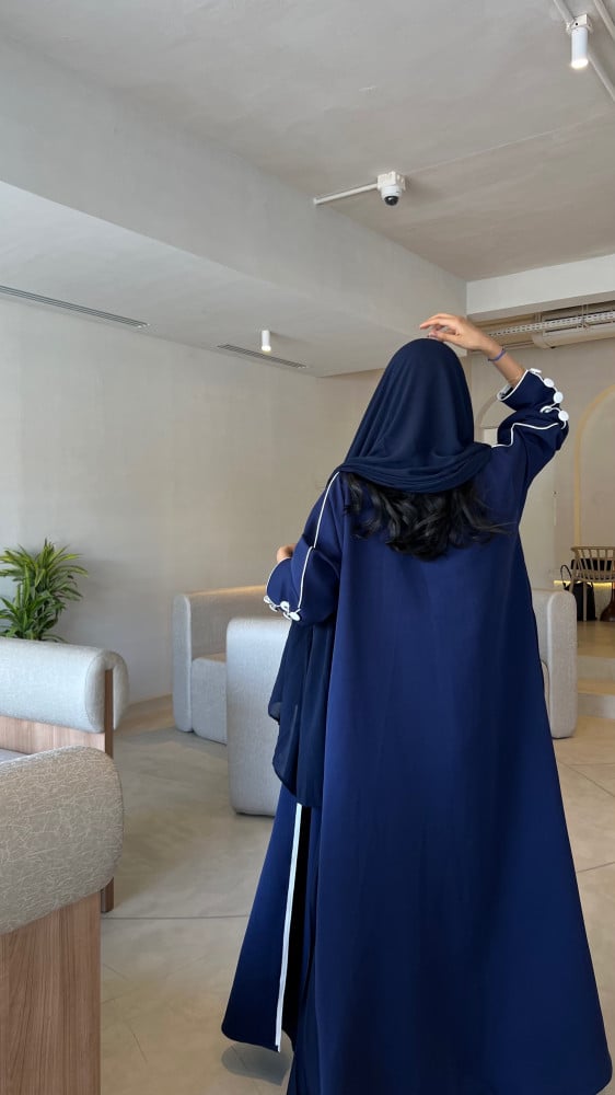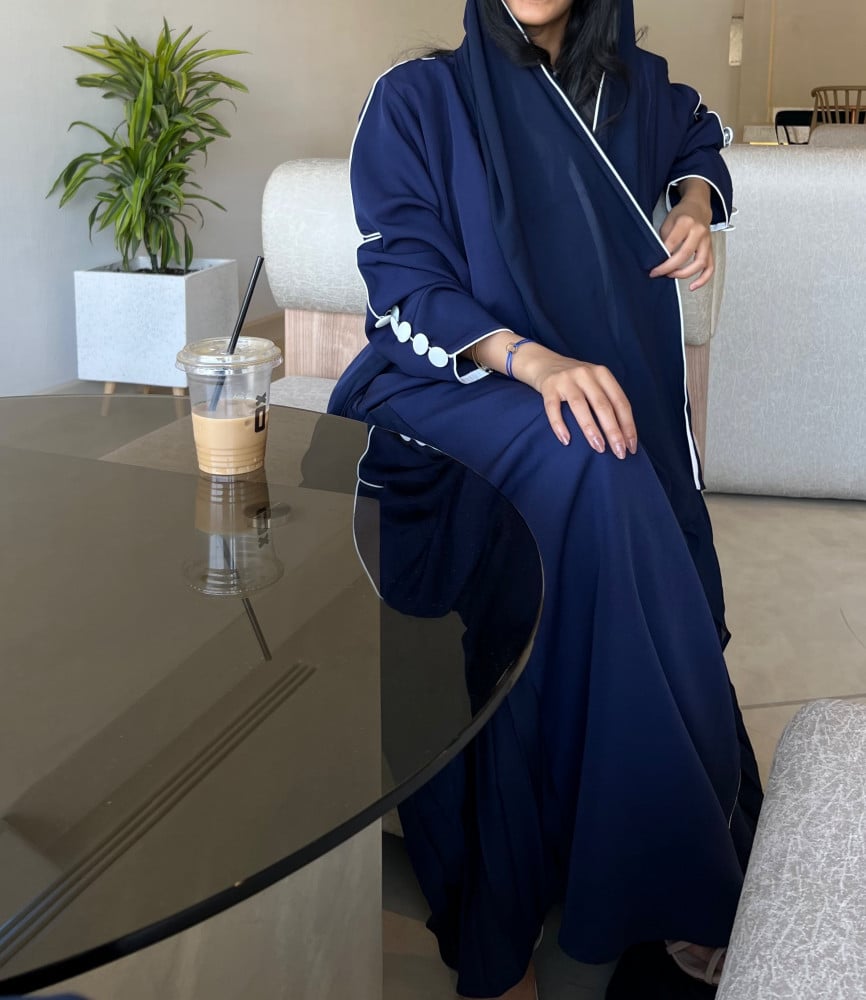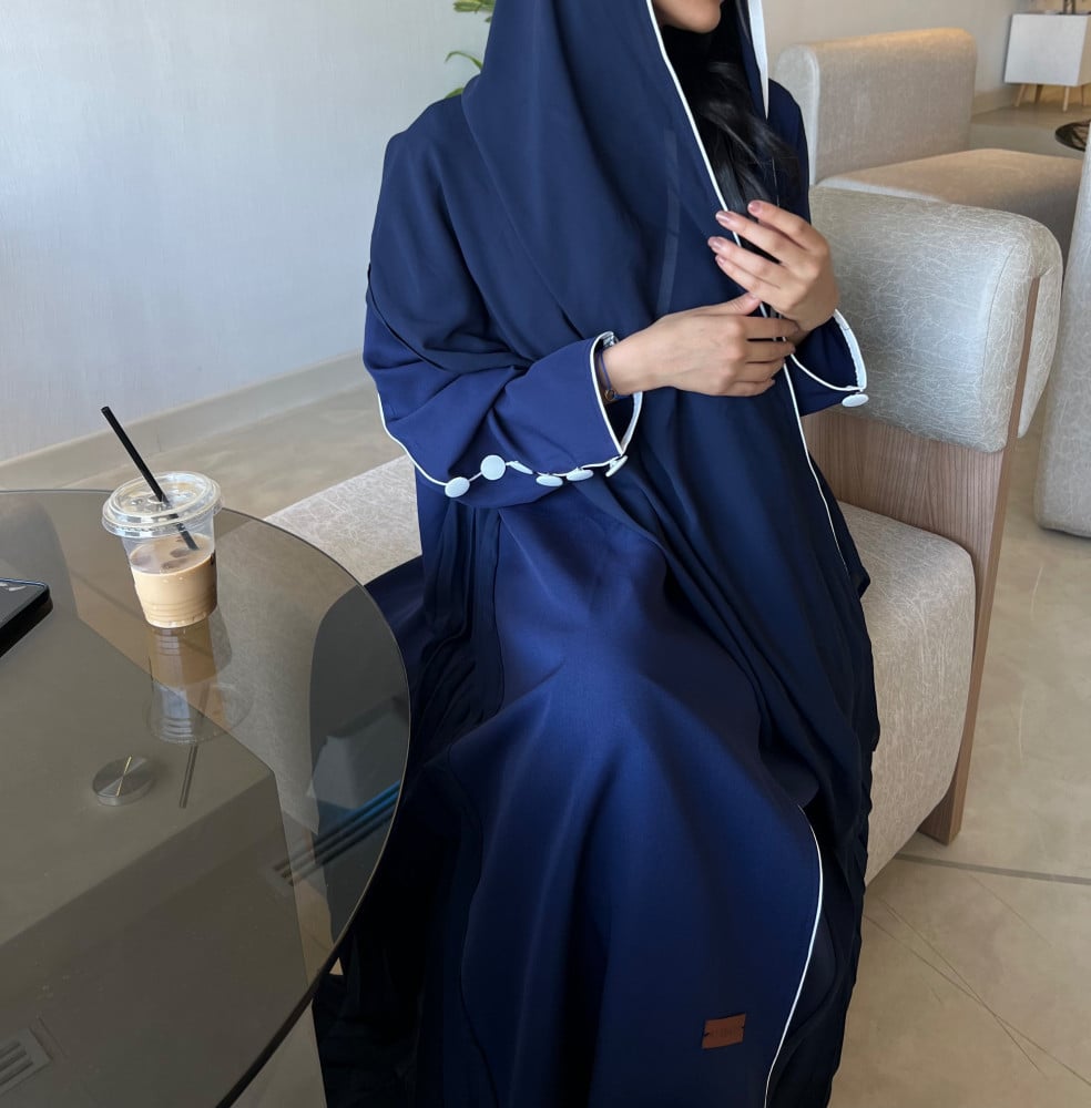 العبايه مع طرحتها الكحليه بتحديد من اللون الابيض.